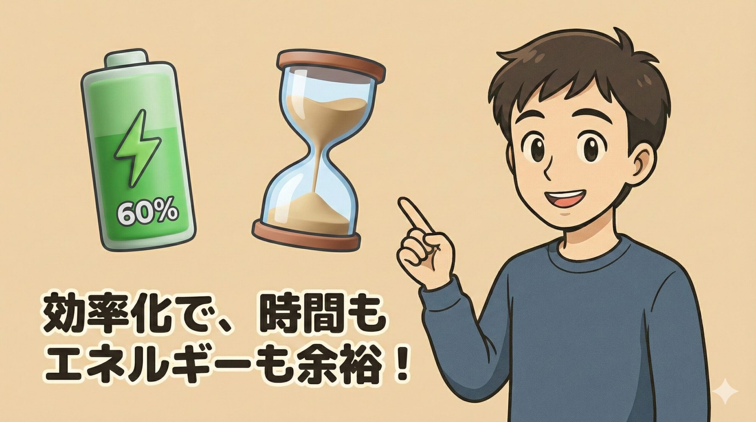 「本業は60点でいい」。忙しい30代・40代の子育て会社員へ、AIと時短術を駆使して定時で帰るための「ズルい仕事術」を紹介。残業を減らし、副業と家族のための時間を生み出すための実践ログです。