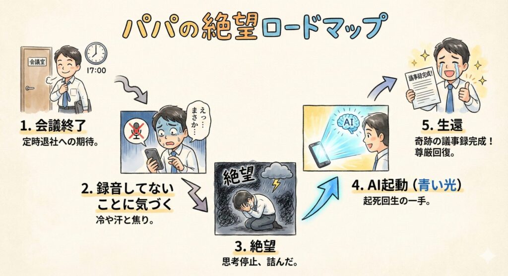 戦友、お疲れ様でした。 会議の録音を忘れるのは、育児や仕事で心身ともに疲弊している僕らにとって、ある意味**避けられないトラブル**かもしれません。 でも、その絶望をAIという強力な武器で乗り越え、家族との時間を守ることが、僕らの「**AI活用世代の新しい戦い方**」です。 今日学んだのは、以下の3点です。 1. **録音なしでも絶望するな**: 殴り書きメモと前提情報で90%リカバリーできる。 2. **神プロンプトを使え**: AIに明確な役割を与え、整理と抽出を同時に行わせる。 3. **セキュリティは死守**: 機密情報は必ずマスク(置換)してからAIに入力する。 さあ、今日から「手動での議事録作成」は完全に卒業です。 その分できた時間で、子どもに絵本を読んであげましょう。 それが、僕らパパブロガーがAIを使う、ただ一つの理由です。