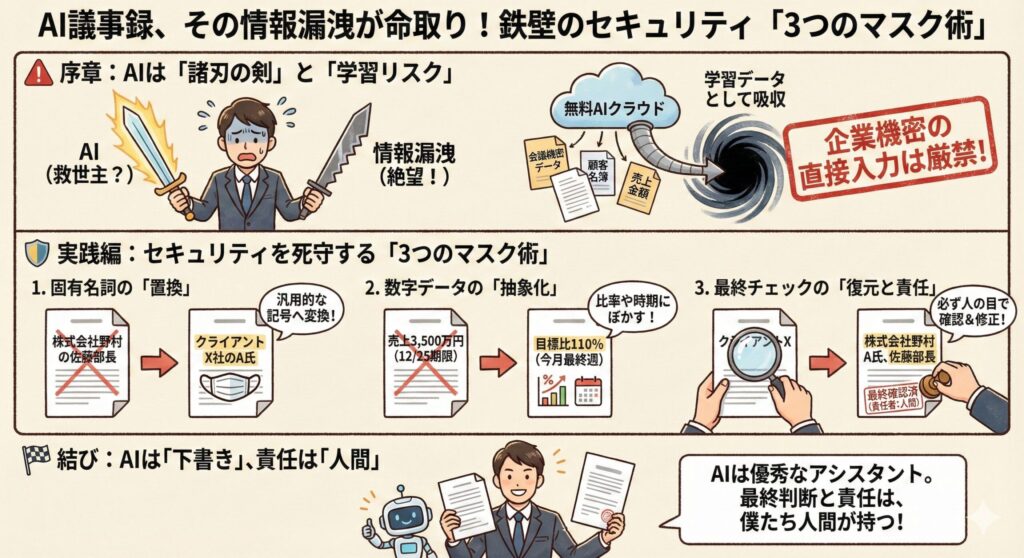 AIは僕らの救世主ですが、使い方を間違えると、会社の情報漏洩という新たな絶望を招きます。 特に、僕たちが扱うデータは「会議の内容」という機密情報です。 AIを使う上で、絶対に守ってほしいルールを共有します。