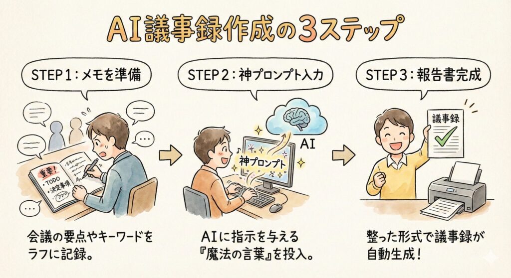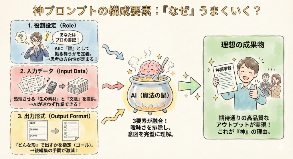 ここが本記事のコアとなる部分です。 AIは、**「誰として」「何をして」「どういう形式で出すか」**を明確にしないと、期待通りのアウトプットを出しません。 特に「録音なし」の状況では、**「最重要ポイントを抽出させる」**指示が命綱となります。